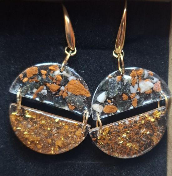 Kolczyki zaprojektowane wg. zamysłu Magdaleny Wolińskiej -Riedi inspirowane pierwotnymi żywiołami – ziemią, ogniem i powietrzem. Połączenie kruszonej cegły, tufu wulkanicznego i lawy – materiałów z których wzniesiono Koloseum. Całość opowiada o równowadze między żywiołami, a prostotą, z której rodzi się piękno. Całość zapakowana w pudełko sygnowane inicjałami Magdaleny Wolińskiej – Riedi.
